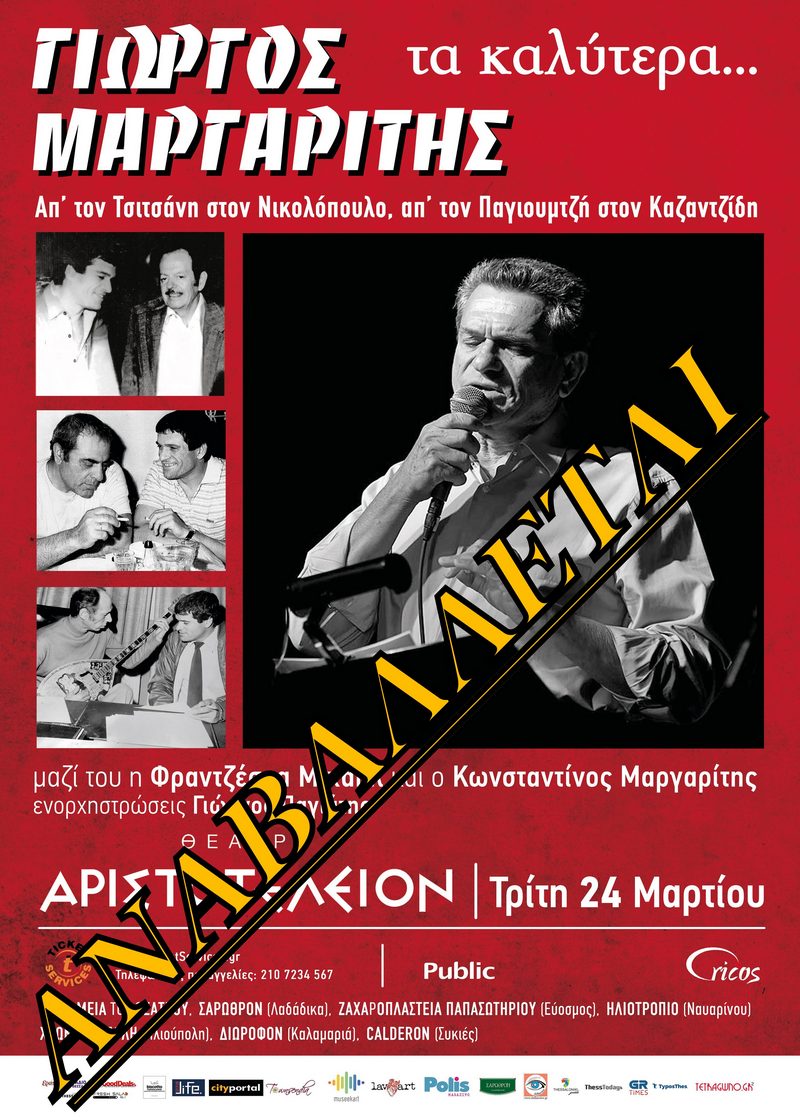 Δυστυχώς, λόγω της εφαρμογής των μέτρων για τον κορωνοϊό (COVID-19), η προγραμματισμένη μας συναυλία με τον Γιώργο Μαργαρίτη στις 24 Μαρτίου στο Αριστοτέλειον θέατρο στη Θεσσαλονίκη, δεν θα πραγματοποιηθεί.
