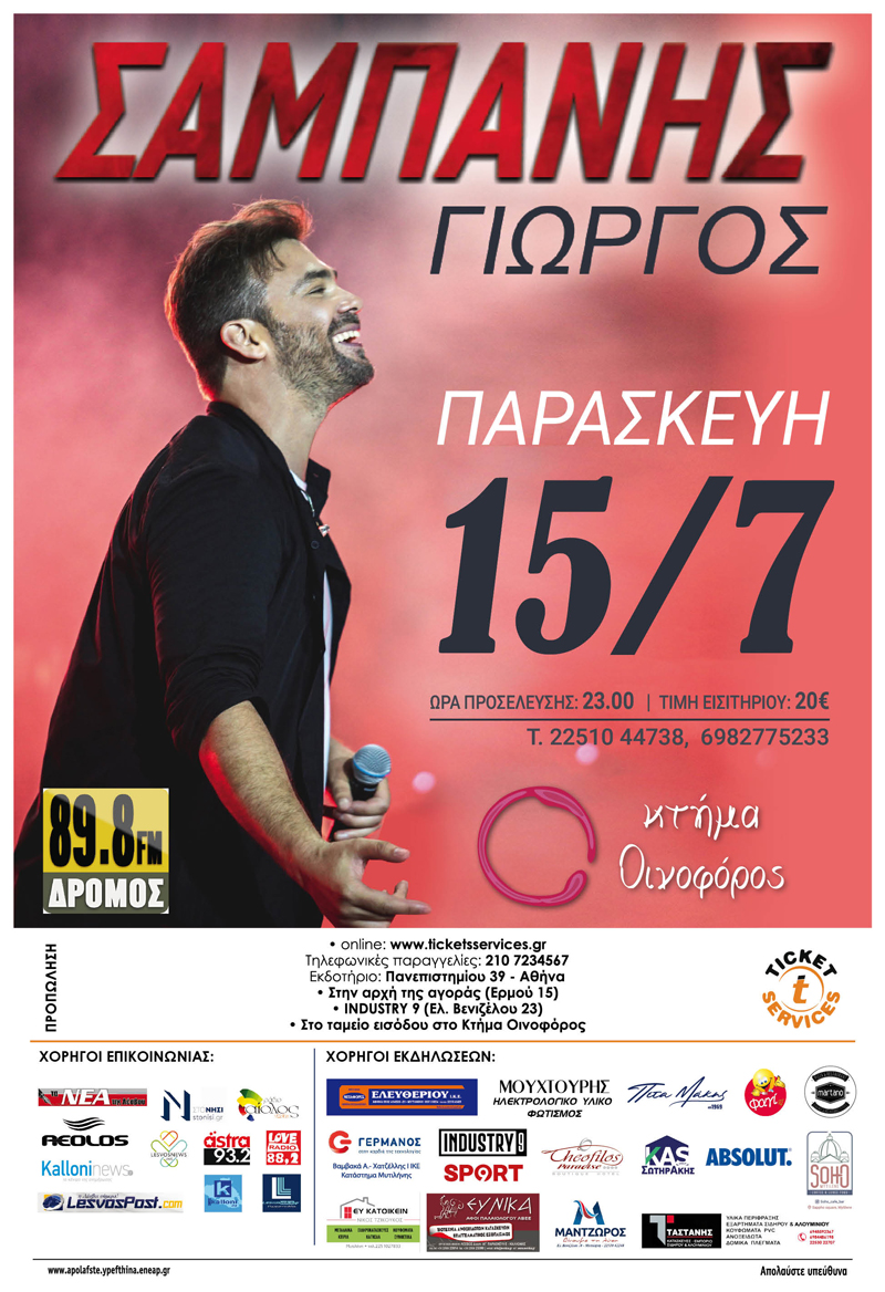 Ο Γιώργος Σαμπάνης, ο πιο αγαπητός, δημοφιλής και ανατρεπτικός τραγουδιστής της νεότερης γενιάς, θα ξεσηκώσει την Παρασκευή 15 Ιουλίου τους φίλους και θαυμαστές του με ένα εκρηκτικό live στο ΚΤΗΜΑ ΟΙΝΟΦΟΡΟΣ , παρουσιάζοντας ένα δυναμικό μουσικό πρόγραμμα που θα μας απογειώσει !!!!