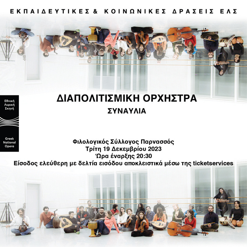 Η Διαπολιτισμική Ορχήστρα της Εθνικής Λυρικής Σκηνής αποχαιρετά το 2023 με μια μοναδική συναυλία την Τρίτη 19 Δεκεμβρίου 2023 στις 20.30 στον Φιλολογικό Σύλλογο Παρνασσός, με ελεύθερη είσοδο για το κοινό.