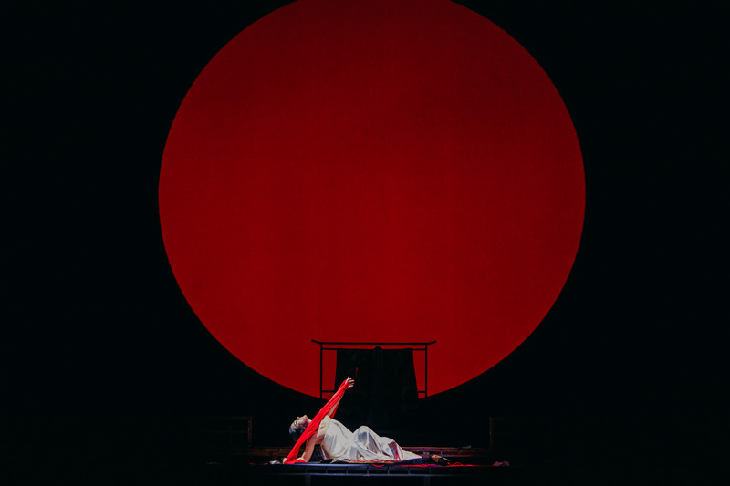 Τη σκηνοθεσία, τα σκηνικά και τα κοστούμια της παραγωγής, η οποία πρωτοπαρουσιάστηκε το 2013 στο Ηρώδειο και αναβίωσε σε μια νέα εκδοχή για τη σκηνή της Αίθουσας Σταύρος Νιάρχος, υπογράφει ο διάσημος Αργεντινός σκηνοθέτης Ούγκο ντε Άνα. Πρόκειται για μια εντυπωσιακή παραγωγή με παραδοσιακά γιαπωνέζικα κοστούμια, ενώ τα σκηνικά και οι προβολές εικονοποιούν με εντυπωσιακό τρόπο τη χώρα του ανατέλλοντος ηλίου από τη μια και τον ψυχισμό της ηρωίδας από την άλλη. Τις προβολές υπογράφει ο Σέρτζιο Μετάλλι, ενώ τους φωτισμούς ο Βαλέριο Αλφιέρι.
