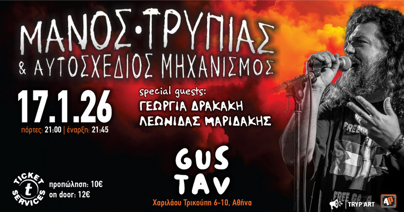 Ο - εκ Χανίων - τραγουδοποιός Μάνος Τρυπιάς για μια μοναδική εμφάνιση στο φιλόξενο Gustav, με υλικό απ' την δισκογραφία του και την - μέχρι σήμερα - διαδρομή του, καθώς και επιλεγμένες διασκευές τραγουδιών άλλων δημιουργών, που τον επηρέασαν και διαμόρφωσαν το καλλιτεχνικό του ύφος ♪ Μια βραδιά με ήχους, συναισθήματα και βιωματικές ιστορίες, βασισμένες σε τραγούδια που γεννήθηκαν από το πάθος και την αλήθεια.