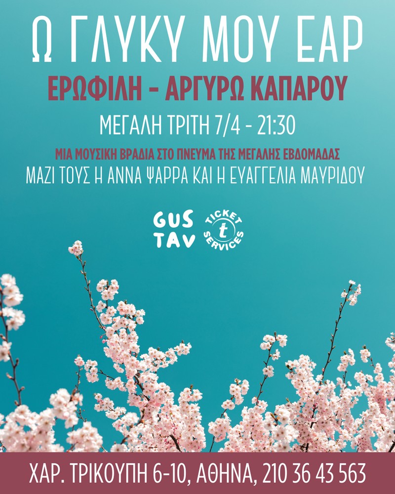 Τη Μεγάλη Τρίτη, δύο ξεχωριστές ερμηνεύτριες, η Ερωφίλη και η Αργυρώ Καπαρού, συναντιούνται σε μια ιδιαίτερη μουσική παράσταση αφιερωμένη στη μνήμη, την απουσία και τη δύναμη της αγάπης. Μια βραδιά όπου η μελοποιημένη ποίηση, οι ύμνοι και τα τραγούδια δημιουργούν μια κατανυκτική ατμόσφαιρα στο πνεύμα της Μεγάλης Εβδομάδας.