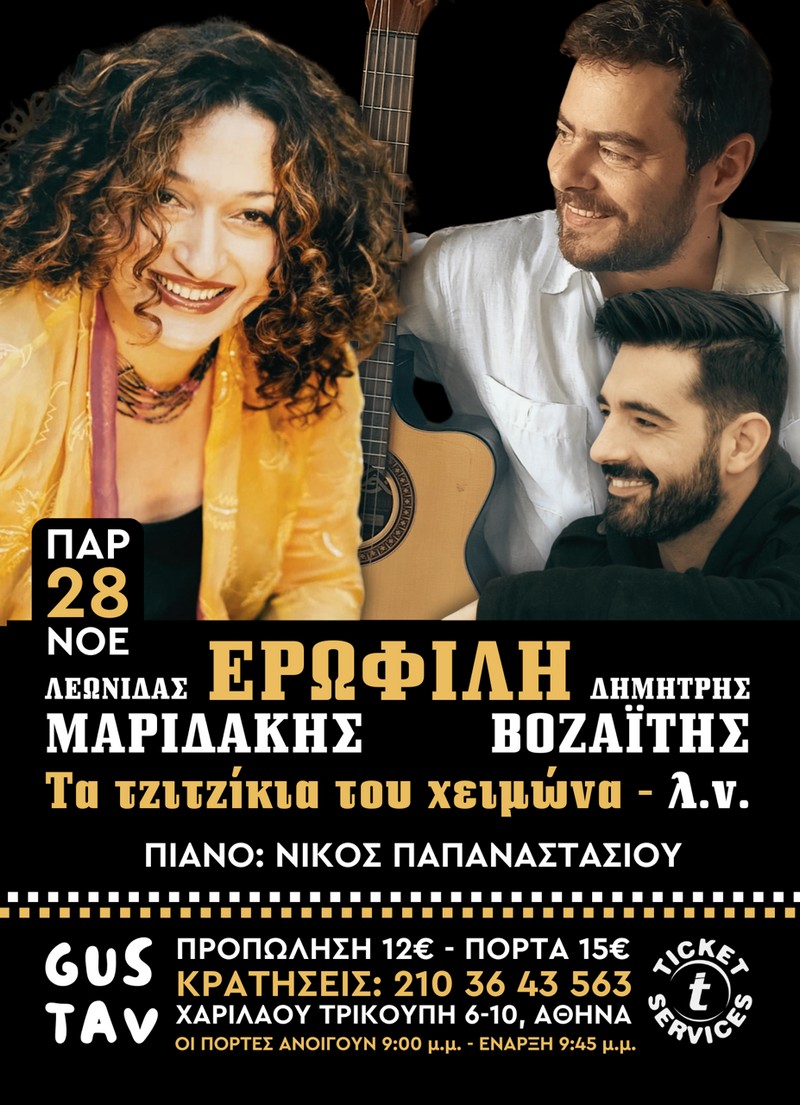 • Παρασκευή 28 Νοεμβρίου 2025, 21:45 ΕΡΩΦΙΛΗ - ΛΕΩΝΙΔΑΣ ΜΑΡΙΔΑΚΗΣ - ΔΗΜΗΤΡΗΣ ΒΟΖΑΪΤΗΣ