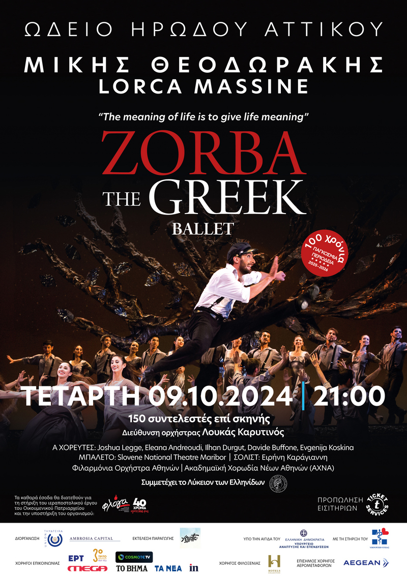 Το πολυβραβευμένο έργο - ορόσημο του σύγχρονου ελληνικού πολιτισμού, ο παγκοσμίου φήμης «Ζορμπάς», επιστρέφει μέσα από τη μεγαλοπρεπή χορογραφία του Lorca Massine στο Ωδείο Ηρώδου του Αττικού, για μία και μοναδική παράσταση, την Τετάρτη 9 Οκτωβρίου.