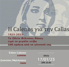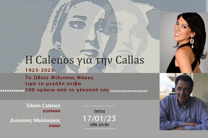 Στο πλαίσιο του εορτασμού για τα 100 χρόνια από τη γέννηση της Μαρίας Κάλλας, το Ωδείο Φίλιππος Νάκας δίνει ολόκληρο το 2023 έμφαση σε συναυλίες γύρω από το οπερατικό και όχι μόνον φωνητικό ρεπερτόριο, με αναφορές στη μεγάλη ντίβα από διακεκριμένους πρωταγωνιστές της λυρικής Τέχνης στην Ελλάδα και το εξωτερικό, όπως η Ελληνίδα σοπράνο Ελένη Calenos που δραστηριοποιείται σε θέατρα εκατέρωθεν του Ατλαντικού.