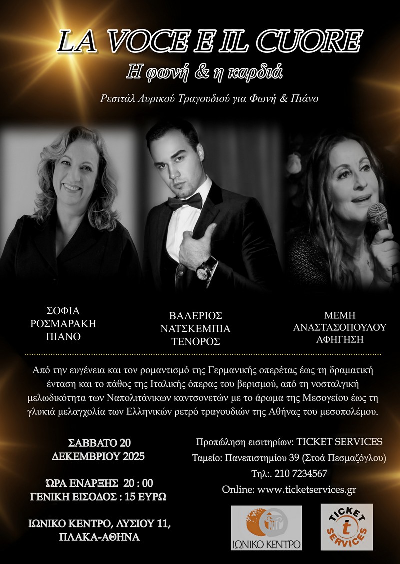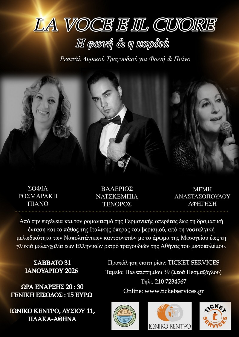 Από την ευγένεια και τον ρομαντισμό της Γερμανικής οπερέτας έως τη δραματική ένταση και το πάθος της Ιταλικής όπερας του βερισμού, από τη νοσταλγική μελωδικότητα των Ναπολιτάνικων καντσονετών με το άρωμα της Μεσογείου έως τη γλυκιά μελαγχολία των Ελληνικών ρετρό τραγουδιών της Αθήνας του Μεσοπολέμου, το ρεσιτάλ αυτό συνθέτει ένα μουσικό ταξίδι που αγγίζει τον έρωτα, τη μνήμη και τη ζωή.