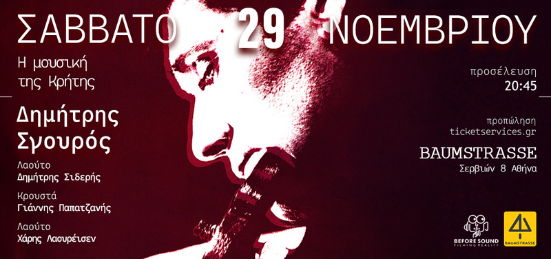 Ο Δημήτρης Σγουρός «αρά και πού» ανεβαίνει στην Αθήνα και είναι σίγουρο πως κι αυτή τη φορά θα μας φέρει από την Κρήτη όμορφους σκοπούς και τραγούδια που θα μας τα προσφέρει ως «Τα Σα εκ των Σων» και θα προσπαθήσει να μετατρέψει το Baumstrasse σε ένα πραγματικό «Χοροστάσι» σαν αυτά που γινότανε παλιά στο χωριό του την Κριτσά Μεραμβέλλου.