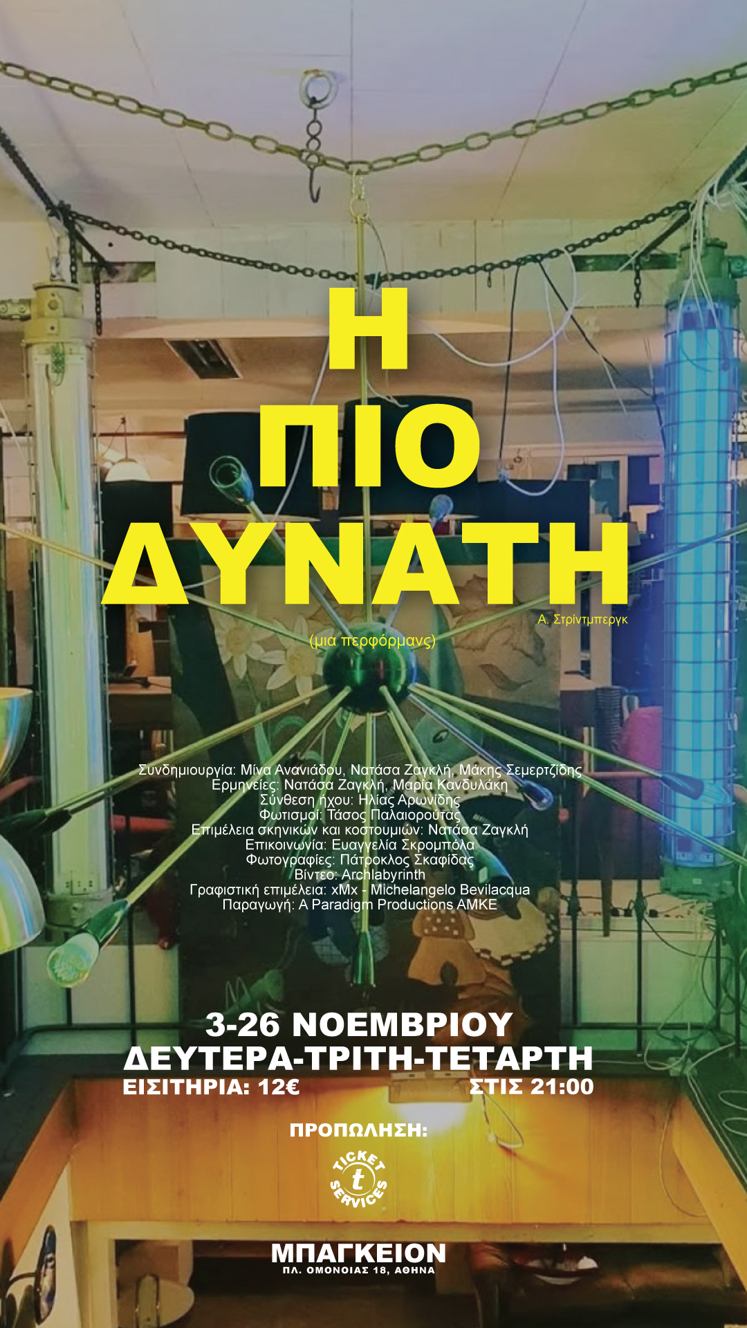 Δύο γυναίκες από τον κόσμο του θεάτρου, ένα καφέ της Στοκχόλμης, οι κοινωνικές νόρμες της οικογένειας, του γάμου και της μητρότητας, καθώς και η ερωτική εξίσωση που εμπλέκει αυτές τις δύο γυναίκες με τον ίδιο άντρα. Αυτά είναι τα βασικά σημεία πάνω στα οποία στηρίζεται το οικοδόμημα του εμβληματικού κειμένου, η «Πιο Δυνατή» με την «Κυρία Χ» να μονολογεί σε αντιπαραβολή με τη βουβή ένταση που φέρει η «Γυναίκα Υ».