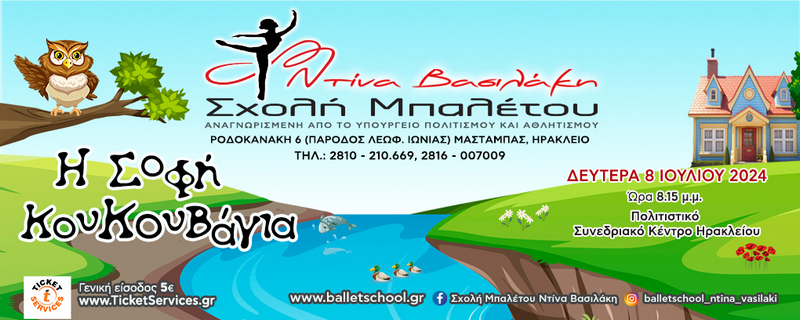 Η σχολή μπαλέτου «Ντίνα Βασιλάκη», στο πλαίσιο της ετήσιας παρουσίασης των τμημάτων της σχολής πραγματοποιεί παράσταση χορού στις 8 Ιουλίου 2024 στις 20:15 στο Πολιτιστικό Συνεδριακό Κέντρο Ηρακλείου. Η παράσταση χωρίζεται σε 3 μέρη.