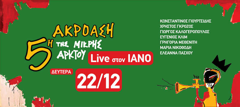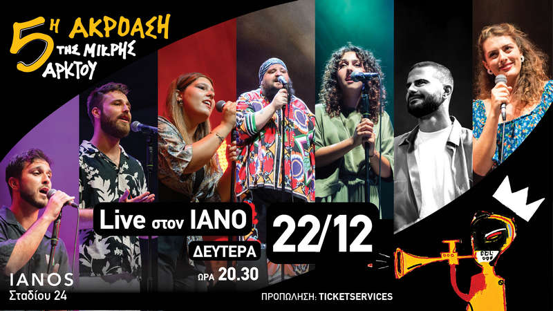 • Δευτέρα 22 Δεκεμβρίου 2025, 20:30 5η ΑΚΡΟΑΣΗ της ΜΙΚΡΗΣ ΑΡΚΤΟΥ LIVE στον IANO IANOS ΕΙΣΙΤΗΡΙΑ