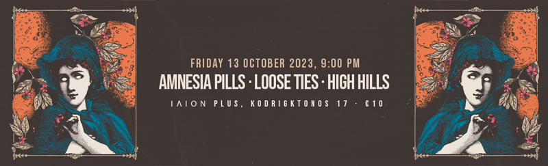 Την Παρασκευή 13/10 3 δυνατές μπάντες της εγχώριας σκηνής, οι Amnesia Pills, οι Loose Ties και οι High Hills, σας προσκαλούν στο ilion+ για μια βραδιά με πολλή μουσική και πολύ δυναμική διάθεση.