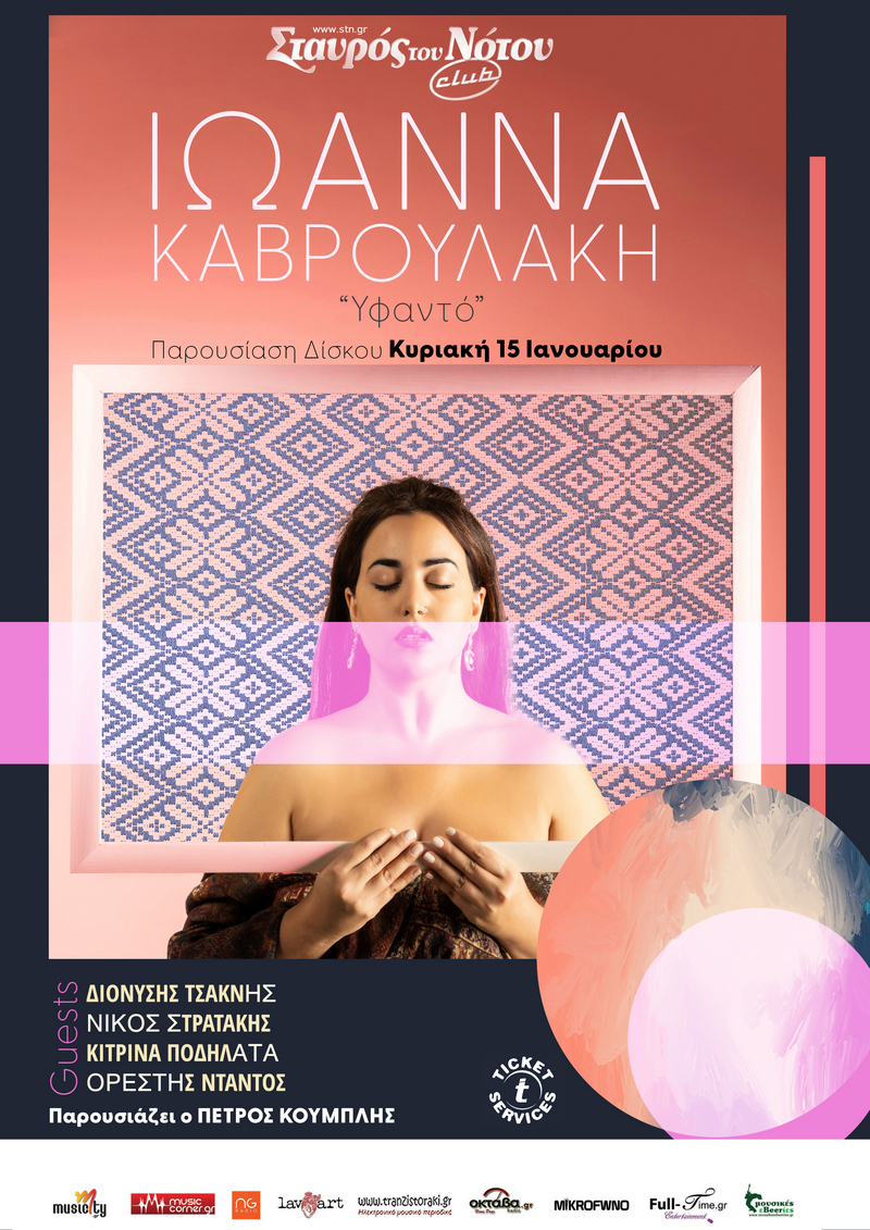 Η Ιωάννα Καβρουλάκη δίνει ραντεβού την Κυριακή 15 Ιανουαρίου στο Club του Σταυρού του Νότου για να μοιραστεί με φίλους και ακροατές το νέο της δίσκο «Υφαντό». Η συναυλία παρουσίασης του παρθενικού της άλμπουμ διανθίζεται με εντυπωσιακές συμμετοχές (Διονύσης Τσακνής, Νίκος Στρατάκης, Κίτρινα Ποδήλατα και Ορέστης Ντάντος) ενώ την παρουσίαση της βραδιάς έχει αναλάβει ο δημοσιογράφος και ραδιοφωνικός παραγωγός Πέτρος Κουμπλής. Ο δίσκος έρχεται να καλύψει την ανάγκη της νέας δημιουργού για μία πρωτότυπη μουσική πρόταση που μοιάζει με κρητικό «Υφαντό».