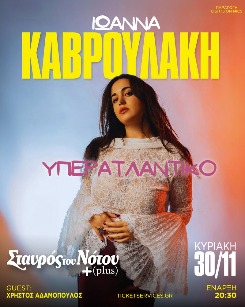 Η Ιωάννα Καβρουλάκη επιστρέφει στη σκηνή του Σταυρού του Νότου, την Κυριακή 30 Νοεμβρίου, για μια βραδιά που σηματοδοτεί την αφετηρία της νέας της εποχής. Με φρέσκια ενέργεια και τη μαγνητική ατμόσφαιρα που τη χαρακτηρίζει, η Ιωάννα μάς καλεί να επιβιβαστούμε στο Υπερατλαντικό - ένα ταξίδι γεμάτο συναίσθημα, ηλεκτρισμό και ελευθερία.
