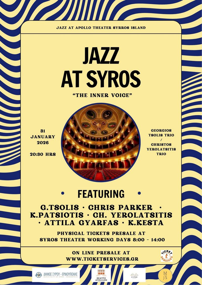 Σάββατο 31 Ιανουαρίου 2026, 20:30JAZZ AT SYROS «The Inner Voice»ΘΕΑΤΡΟ ΑΠΟΛΛΩΝ - ΣΥΡΟΣΕΙΣΙΤΗΡΙΑ