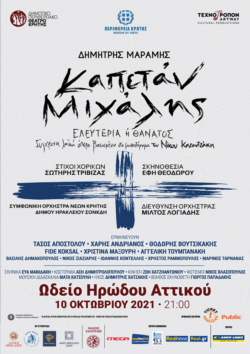 Μετά από τη θριαμβευτική πορεία της στην Κρήτη, η πρωτότυπη σύγχρονη λαϊκή όπερα «Καπετάν Μιχάλης» του συνθέτη Δημήτρη Μαραμή, βασισμένη στο εμβληματικό μυθιστόρημα του Νίκου Καζαντζάκη, έρχεται στο Ηρώδειο την Κυριακή 10 Οκτωβρίου.