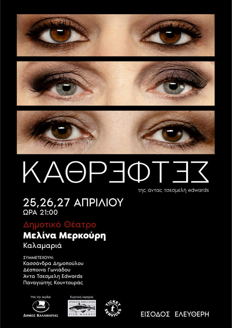 Το πολυβραβευμένο θεατρικό έργο "ΚΑΘΡΕΦΤΕΣ" της Άντας Τσεσμελή Edwards επιστρέφει 𝕣𝕖𝕧𝕚𝕤𝕖𝕕 για λίγες μόνο παραστάσεις υπο την αιγίδα του Δήμου Καλαμαριάς. Το έργο φέτος στηρίζει το Κοινωνικό Παντοπωλείο Καλαμαριάς, αντί εισιτηρίου το κοινό καλείται να φέρει κάποιο είδος ατομικής υγιεινής (σαμπουάν, αφρόλουτρα, μωρομάντηλα, σερβιέτες).