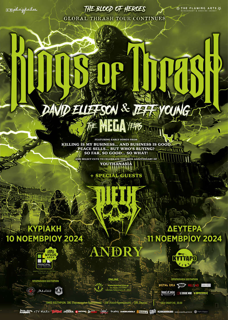 Ο David Ellefson, πάντως, εκείνα τα βράδια θα κάνει διπλοβάρδια, αφού τις συναυλίες θα ανοίξουν οι death / thrashers DIETH, οι οποίοι αποτελούνται από τον ίδιο, τον κιθαρίστα/ τραγουδιστή Guilherme Miranda (νυν KROW, πρώην ENTOMBED A.D., κ.λ.π.) και τον ντράμμερ Michał M. Łysejko (πρώην DECAPITATED, κ.λ.π.). Οι DIETH, κυκλοφόρησαν το ντεμπούτο τους, με τίτλο “To Hell And Back", πέρσι το καλοκαίρι και αποτελούν τον ιδανικό συνδετικό κρίκο με τους KINGS OF THRASH. Όπως και να έχει, εκείνο το βράδυ, οι KINGS OF THRASH μαζί με τους DIETH και πιθανώς με ένα ακόμα ξένο σχήμα, αναμένεται να μας προσφέρουν μία βραδιά που θα μας μείνει αξέχαστη. Να φροντίστε να είστε εκεί, new και old school οπαδοί!