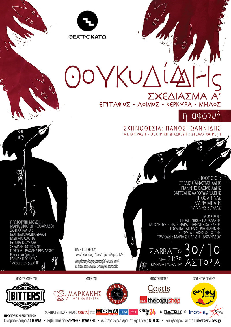 Το ΘΕΑΤΡΟΚΑΤΩ, είναι ένα ζωντανό κύτταρο πολιτισμού στην καρδιά της πόλης του Ηρακλείου. Σήκωσε την αυλαία του πριν από 5 χρόνια κι έχει επιδείξει μια πλούσια δραστηριότητα με πάνω από 30 έργα που αγκαλιάστηκαν θερμά από το κοινό. Τον περασμένο Σεπτέμβρη παρουσίασε στο ΤΕΙ το έργο «Θουκυδίδης/ Σχεδίασμα Α'» σε σκηνοθεσία Πάνου Ιωαννίδη. Λόγω της ανταπόκρισης που βρήκε στο θεατρόφιλο κοινό της πόλης μας, προγραμμάτισε μια ακόμα παράσταση για το Σάββατο 30 Οκτωβρίου στο κινηματοθέατρο «Αστόρια» στο κέντρο της πόλης.