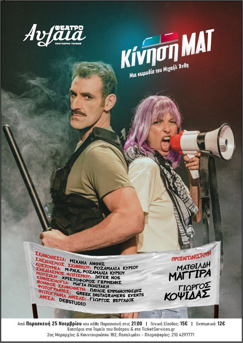 Μ' αυτές τις σκέψεις έγραψα και σκηνοθέτησα την κωμωδία ΚΙΝΗΣΗ ΜΑΤ, όπου ένας άντρας των ΜΑΤ και μία αντιεξουσιάστρια συνυπάρχουν αναγκαστικά για ενενήντα ολόκληρα λεπτά σε μια ταράτσα της πόλης, κι ενώ από κάτω είναι σε εξέλιξη μια επεισοδιακή διαδήλωση. Η σύγκρουση ανάμεσα σΆ αυτούς τους δύο είναι ολομέτωπη, με συνεχείς ανατροπές και ξεκαρδιστικά αποτελέσματα, μέχρι το αναπάντεχο φινάλε, όπου... Ε, δεν θα τα πούμε κι όλα εδώ!