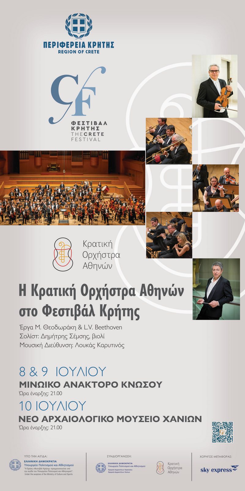 Βρισκόμαστε στην Κρήτη, όπου η Κρατική Ορχήστρα Αθηνών αποβιβάζεται για τρεις συναυλίες στις 8, 9 και 10 Ιουλίου. Οι δύο πρώτες, μάλιστα, πραγματοποιούνται στον αρχαιολογικό χώρο της Κνωσού, στον οποίο η Ορχήστρα φιλοξενείται για πρώτη φορά στη μακρά ιστορία της, ενώ στις 10 Ιουλίου, οι μουσικοί εμφανίζονται στο Αρχαιολογικό Μουσείο Χανίων. Από το πρόγραμμα δεν θα μπορούσε να λείπει ένα έργο του μεγάλου μας Μίκη Θεοδωράκη, ιδιαιτέρως μάλιστα όταν οι συναυλίες αυτές πραγματοποιούνται μόλις έναν χρόνο μετά την απώλειά του. Πέραν του δικού του ατμοσφαιρικού Adagio, ο Καλλιτεχνικός Διευθυντής της Κρατικής Ορχήστρας Αθηνών, Λουκάς Καρυτινός, ηγείται της ερμηνείας της αειθαλούς και γεμάτης φρεσκάδα Πρώτης Συμφωνίας του Μπετόβεν, ενώ ο καταξιωμένος βιολιστής και εξάρχων της Κρατικής Ορχήστρας Αθηνών, Δημήτρης Σέμσης, αναμετράται με το Κοντσέρτο του Μπετόβεν, τον αδιαμφισβήτητο «Παρθενώνα» των βιολονιστικών κοντσέρτων.