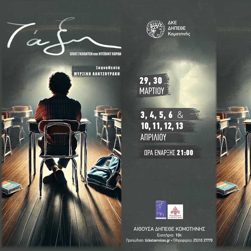 Η Δημοτική Κοινωφελής Επιχείρηση Δημοτικού Περιφερειακού Θεάτρου Κομοτηνής παρουσιάζει στην Κεντρική της Σκηνή το έργο των Iseult Golden & David Horan ΤΑΞΗ