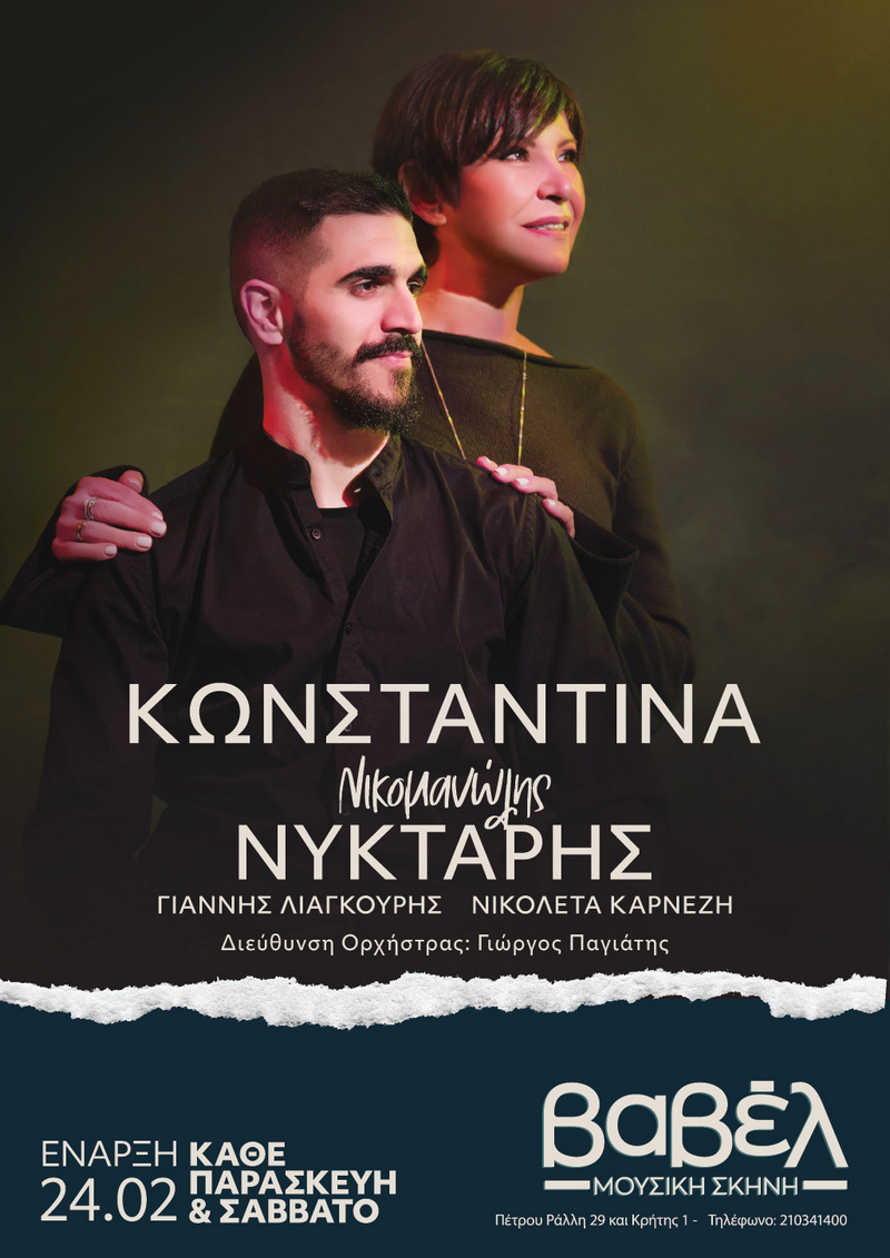Δύο φωνές, δυο σχολές, δυο γενιές ενώνονται στη ΒΑΒΕΛ. Η Κωνσταντίνα και ο Νικομανώλης Νύκταρης θα εμφανίζονται στη νέα μουσική σκηνή, ΒΑΒΕΛ στην οδό Πέτρου Ράλλη 29 από το Σάββατο 24 Φεβρουαρίου και για κάθε Παρασκευή και Σάββατο. Οι δύο ερμηνευτές έχουν ετοιμάσει ένα ζωντανό πρόγραμμα με αγαπημένα τραγούδια που περιλαμβάνει όλες τις μεγάλες επιτυχίες της Κωνσταντίνας, από τις ερωτικές μπαλάντες έως τα δυναμικά ζεϊμπέκικα αλλά και τις παραδοσιακές μαντινάδες και τα σύγχρονα ριζίτικα τραγούδια, που χαρακτηρίζουν κυρίως το ρεπερτόριο του Νικομανώλη Νύκταρη. Όλα, από τον πλούτο του ελληνικού τραγουδιού και της παράδοσης σ' ένα «ΒΑΒΕΛ» ανακάτεμα!
