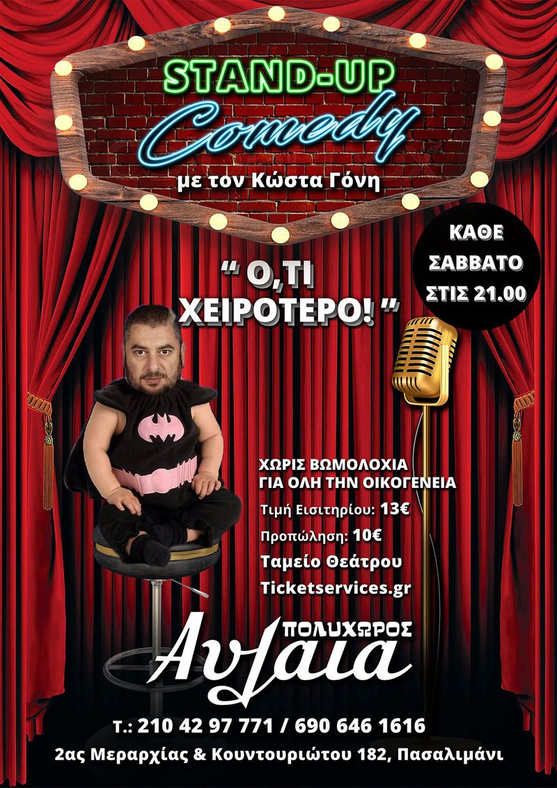 Από το Σάββατο 19 Φεβρουαρίου και κάθε Σάββατο στις 22:00, ο 'Πολυχώρος Αυλαία' στον Πειραιά, φιλοξενεί στο  UPSTAGE την παράσταση  «Ό,τι χειρότερο»  με τον Stand-Up Comedian, Κώστα Γόνη.