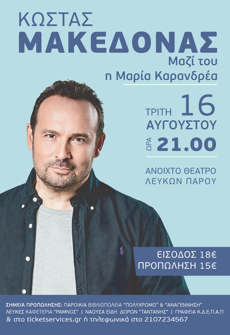 Ο Κώστας Μακεδόνας μας προσκαλεί την Τρίτη 16/8/2022 στο Ανοιχτό Θέατρο Λευκών Πάρου στις 21:00. Οι φίλοι του Κώστα Μακεδόνα θα έχουν την ευκαιρία να τον ακούσουν και να διασκεδάσουν με τις μεγάλες του επιτυχίες!