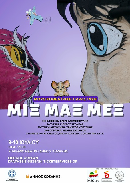 Ο Δήμος Κοζάνης σε συνεργασία με το Παιδιατρικό Κέντρο «Κιβωτός», την Καλλιτεχνική Ομάδα «Εν Δυνάμει» και το Δημοτικό Ωδείο Κοζάνης παρουσιάζουν τη Μουσικοθεατρική Παράσταση «Μιξ, Μαξ, Μεξ» στις 9 & 10 Ιουλίου, 2024 στο Δημοτικό Υπαίθριο Θέατρο Κοζάνης (Θεατράκι)