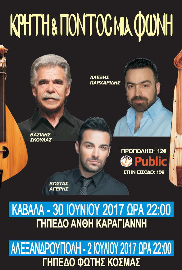 Από την Κρήτη συμμετέχουν ο μοναδικός και ασύγκριτος ΒΑΣΙΛΗΣ ΣΚΟΥΛΑΣ με την τετραμελή ορχήστρα του και για τον Πόντο α) ο πασίγνωστος και αγαπημένος ερμηνευτής ΠΑΡΧΑΡΙΔΗΣ ΑΛΕΞΗΣ και β) το νέο αίμα της Ποντιακής και όχι μόνο μουσικής και νικητής του μουσικού τηλεοπτικού διαγωνισμού Voice 2 το 2015, ΚΩΣΤΑΣ ΑΓΕΡΗΣ, με την εννεαμελή ορχήστρα τους.