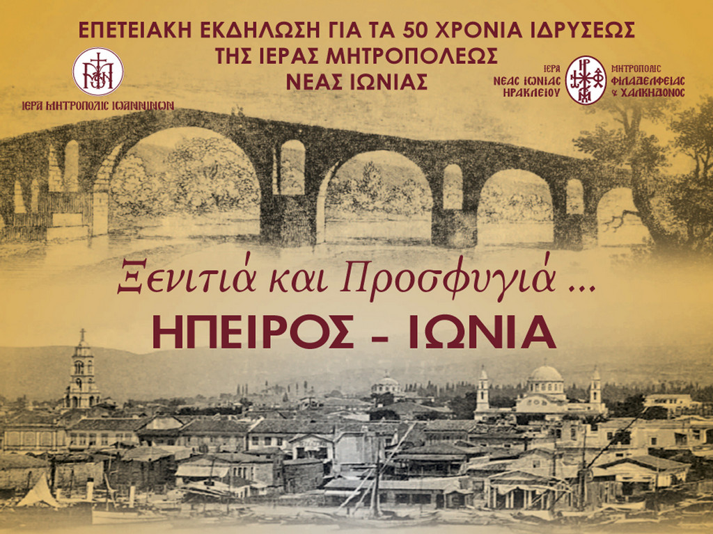 Στο πλαίσιο των εορταστικών εκδηλώσεων για την συμπλήρωση 50 ετών από την ίδρυσή της (1974-2024), η Ιερά Μητρόπολη Νέας Ιωνίας, Φιλαδελφείας, Ηρακλείου και Χαλκηδόνος διοργανώνει, σε συνεργασία με την Ιερά Μητρόπολη Ιωαννίνων, επετειακή μουσικοχορευτική παράσταση, η οποία θα πραγματοποιηθεί την Δευτέρα 7 Οκτωβρίου 2024 στο Ωδείο Ηρώδου του Αττικού, με τίτλο: «Ξενιτιά και Προσφυγιά… ΗΠΕΙΡΟΣ – ΙΩΝΙΑ», σε σκηνοθετική και καλλιτεχνική επιμέλεια του Ζαχαρία Καρούνη.