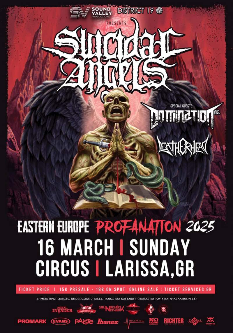 Στα πλαίσια της παγκόσμιας περιοδείας για την προώθηση της όγδοης σε σειρά δισκογραφικής τους κυκλοφορίας, του εξαιρετικού “Profane Prayer” που σάρωσε τα Ευρωπαϊκά charts, αποτελώντας ταυτόχρονα την πλέον τεχνική και ώριμη δουλειά του κουαρτέτο από την Αθήνα. Δημιουργημένοι ένα τέταρτο του αιώνα πριν, το 2001, από τον κιθαρίστα, τραγουδιστή και κινητήριο δύναμη της μπάντας, Νίκο Μελισσουργό, οι Suicidal Angels δεν σταματούν να απασχολούν το κοινό του ακραίου ήχου σε παγκόσμια κλίμακα, με κορυφαίες στιγμές τους τα ευρείας αποδοχής full albums Bloodbath (2012) και Years of Aggression (2019). Οι περιοδείες τους ανά την υφήλιο είναι ασταμάτητες, ενώ κατ εξακολούθηση φιλοξενούνται στα σημαντικότερα metal festivals παγκοσμίως, όπως τα Wacken Open Air, Metalcamp, Sonisphere και Brutal Assault Open Air.