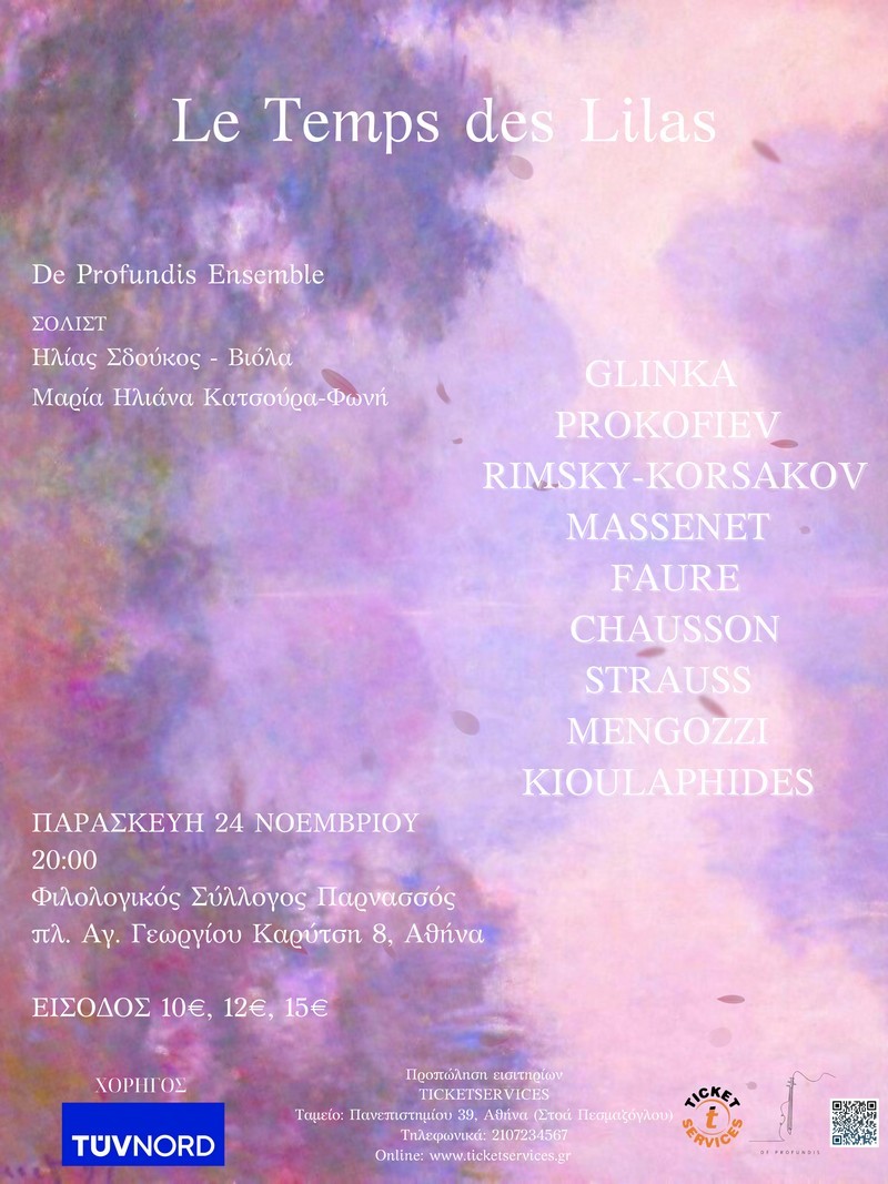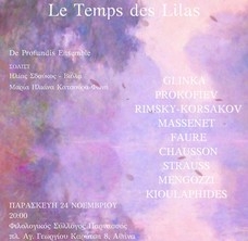 "Le Temps des Lilas". Η βραδιά αρχίζει με ένα έργο του Ιταλού συνθέτη Fabio Mengozzi αφιερωμένο στους δύο σολίστ. Έργο με έντονα στοιχεία βυζαντινής μυσταγωγίας. Ακολουθεί το έργο "Saaremaa" Φαντασία για βιόλα και έγχορδα του Βίκτωρ Κιουλαφίδη, η Καντάτα "Το πεδίο των νεκρών" από την κινηματογραφική μουσική του Sergei Prokofiev για την ταινία του Sergei Eisenstein "Alexander Nevsky", η ημιτελής σονάτα για βιόλα και πιάνο του Mikhail Glinka σε μεταγραφή για βιόλα και έγχορδα, έργα των Nikolai Rimsky-Korsakov, Jules Massenet, Gabriel Faure, από το έργο του Ernest Chausson "Poeme de l'amour et de la mer" το ιντερλούδιο και το τραγούδι "Le Temps des Lilas" από το οποίο εμπνέεται ο τίτλος της μουσικής βραδιάς και η συναυλία με ένα τραγούδι του Richard Strauss. Η μουσική προσαρμογή για το συγκεκριμένο σύνολο όπου χρειάστηκε, είναι έργο του συνθέτη και βιολίστα Μάριου Δαπέργολα.