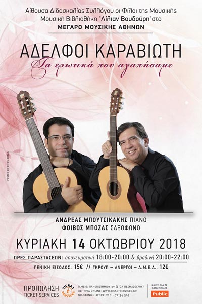 Την Κυριακή 14 Οκτωβρίου 2018 στην Αίθουσα Διδασκαλίας της Μουσικής Βιβλιοθήκης «Λίλιαν Βουδούρη» στο Μέγαρο Μουσικής Αθηνών (Βασιλίσσης Σοφίας & Κόκκαλη) οι τραγουδιστές της αγάπης, αδελφοί Καραβιώτη, πραγματοποιούν την έναρξη των χειμερινών τους εμφανίσεων με τη συναυλία: