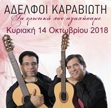 Την Κυριακή 14 Οκτωβρίου 2018 στην Αίθουσα Διδασκαλίας της Μουσικής Βιβλιοθήκης «Λίλιαν Βουδούρη» στο Μέγαρο Μουσικής Αθηνών (Βασιλίσσης Σοφίας & Κόκκαλη) οι τραγουδιστές της αγάπης, αδελφοί Καραβιώτη, πραγματοποιούν την έναρξη των χειμερινών τους εμφανίσεων με τη συναυλία: