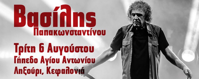 Το βράδυ της Τρίτης 6 Αυγούστου 2024 στο Δημοτικό Γήπεδο Άγιου Αντωνίου Ληξουρίου θα είναι η ευκαιρία μας να απολαύσουμε ξανά τον Βασίλη, τον δικό μας Βασίλη, όπου με την τρυφερή ροκ φωνή και τη ηλεκτρισμένη σκηνική του παρουσία, θα πραγματοποιήσει μια από τις μεγαλύτερες και πιο ξεχωριστές εμφανίσεις της πλούσιας καριέρας του.