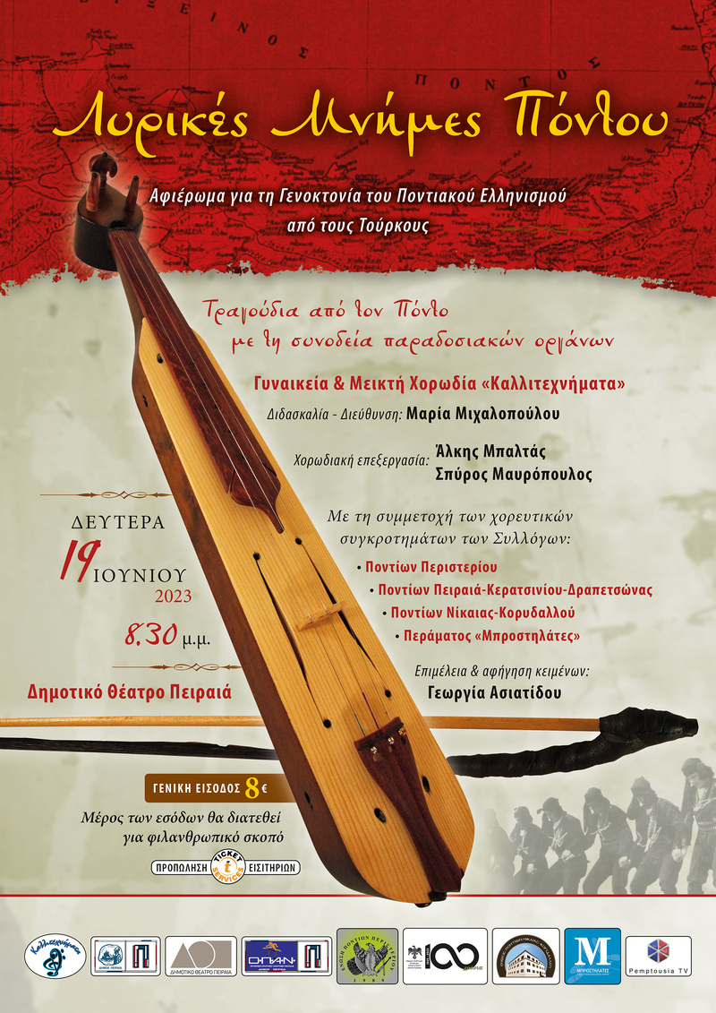 Την 19η Ιουνίου 2023, με αφορμή την 19η Μαΐου, ημέρα μνήμης της Γενοκτονίας των Ελλήνων του Πόντου, η Γυναικεία και Μεικτή χορωδία "Καλλιτεχνήματα" υπό την διδασκαλία και διεύθυνση της κ. Μαρίας Μιχαλοπούλου θα πραγματοποιήσει εκδήλωση στο Δημοτικό Θέατρο Πειραιά εις μνήμην των 353.000 Ποντίων θυμάτων της γενοκτονίας από τους Τούρκους.