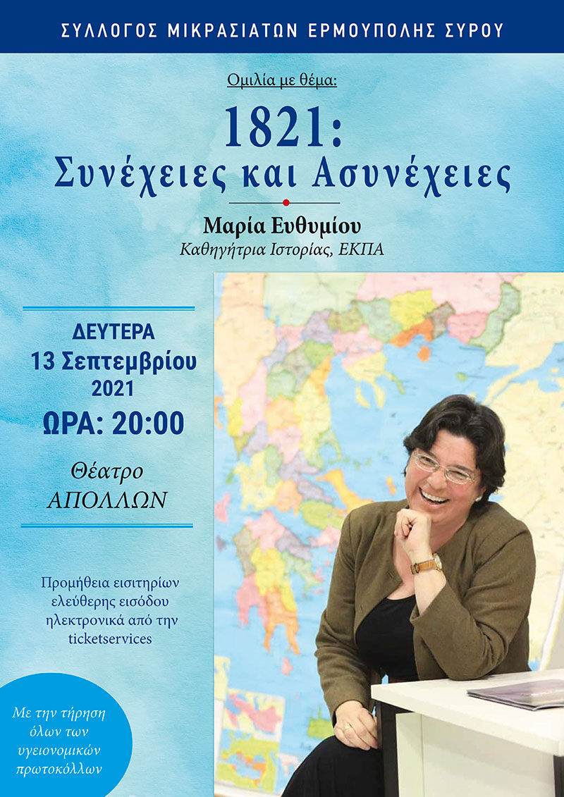 1821: Συνέχειες και Ασυνέχειες» θα διεξαχθεί από το Σύλλογο Μικρασιατών Ερμούπολης Σύρου τη Δευτέρα, 13 Σεπτεμβρίου 2021, στο θέατρο Απόλλων ώρα 20:00. Ομιλήτρια η καταξιωμένη καθηγήτρια Ιστορίας κ. Μαρία Ευθυμίου.