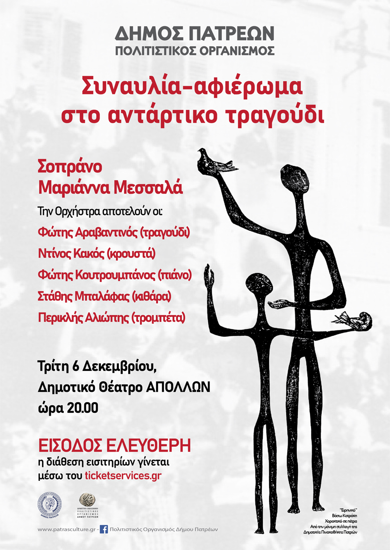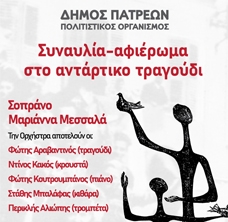 Η πατρινή σοπράνο Μαριάννα Μεσσαλά, μαζί με την ορχήστρα της, ένα αφιέρωμα στο αντάρτικο τραγούδι. Το πρόγραμμα της συναυλίας περιλαμβάνει τραγούδια τα οποία ενέπνευσαν την γενιά της Εθνικής Αντίστασης, του ΕΑΜ, του ΕΛΑΣ και της ΕΠΟΝ να ορθώσουν ανάστημα πολεμώντας και τραγουδώντας. Θα ακουστούν λόγια και γνωστές μελωδίες που ύμνησαν τις μάχες για την κατάληψη μεγάλων πόλεων, καπετάνιους και σώματα, και περιοχές στρατηγικής σημασίας στις οποίες γράφτηκε ο μεγάλος αγώνας του λαού μας.