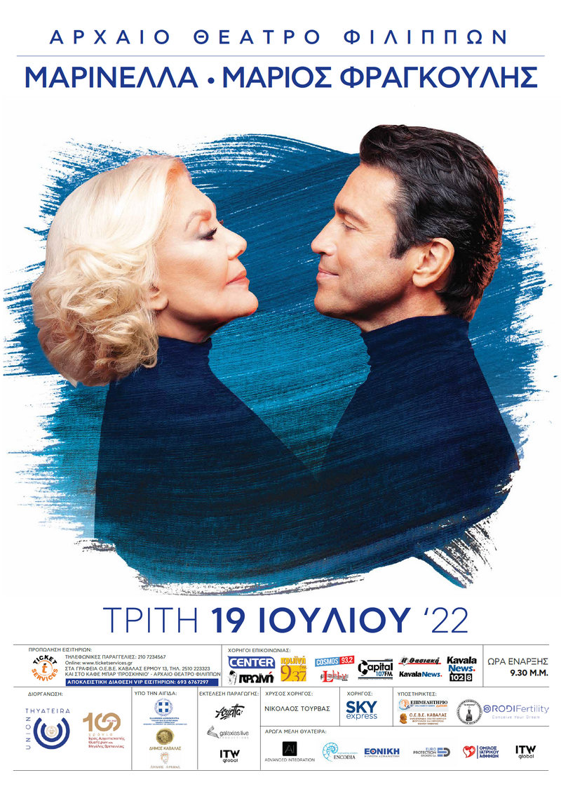 Η Μαρινέλλα και ο Μάριος Φραγκούλης με την αξεπέραστη ερμηνεία τους θα μαγέψουν το κοινό την 19η Ιουλίου στο Αρχαίο Θέατρο Φιλίππων Καβάλας, θέτοντας ακόμα ένα ορόσημο για τον Σύλλογο Θυάτειρα που συναντά την ιστορία του στους Φιλίππους, την περιοχή που συνεχίζει να αποτελεί σύμβολο της δύναμης του αρχαιοελληνικού κόσμου ως γενέτειρα της πρώτης Χριστιανικής κοινότητας στην Ευρώπη και την αφετηρία για την διάδοση του Χριστιανισμού σε όλη την οικουμένη!