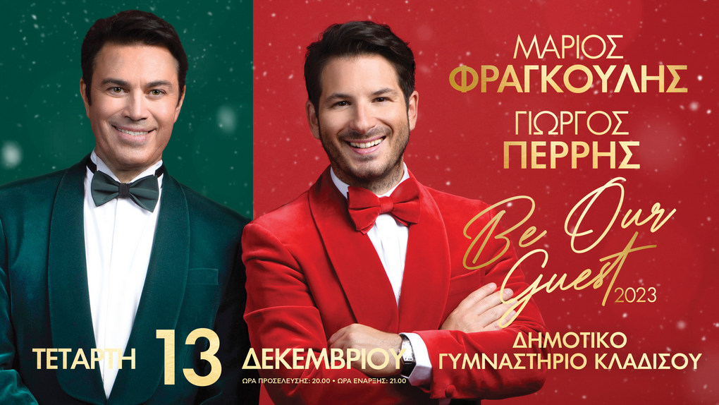 Με τον ίδιο ενθουσιασμό και κοσμοπολίτικο αέρα, ο Μάριος Φραγκούλης και ο Γιώργος Περρής επιστρέφουν φέτος στη σκηνή ως  οικοδεσπότες για να μας χαρίσουν ακόμη μία αξέχαστη σειρά νέων συναυλιών με τίτλο Be Our Guest 2023 !