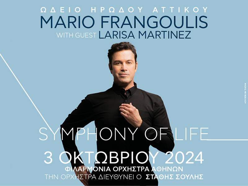 Για όλους όσους τον περίμεναν φέτος το καλοκαίρι ο Μάριος Φραγκούλης επιστρέφει στο Ηρώδειο για μία ανεπανάληπτη εμφάνιση στις 3 Οκτωβρίου. Μέσα από ένα πρόγραμμα ειδικά διαμορφωμένο για τη μοναδική αυτή παράσταση και με εκλεκτή του καλεσμένη τη διακεκριμένη Αμερικανίδα σοπράνο Larisa Martinez, ο σπουδαίος Έλληνας τραγουδιστής ερμηνεύει τη δική του "Συμφωνία" για τη Ζωή. Προσπερνώντας ο,τι του στέρησε την επαφή με τους ακροατές του, αυτός ο ακούραστος ερμηνευτής τραγουδά ξανά για τη χαρά της ζωής.