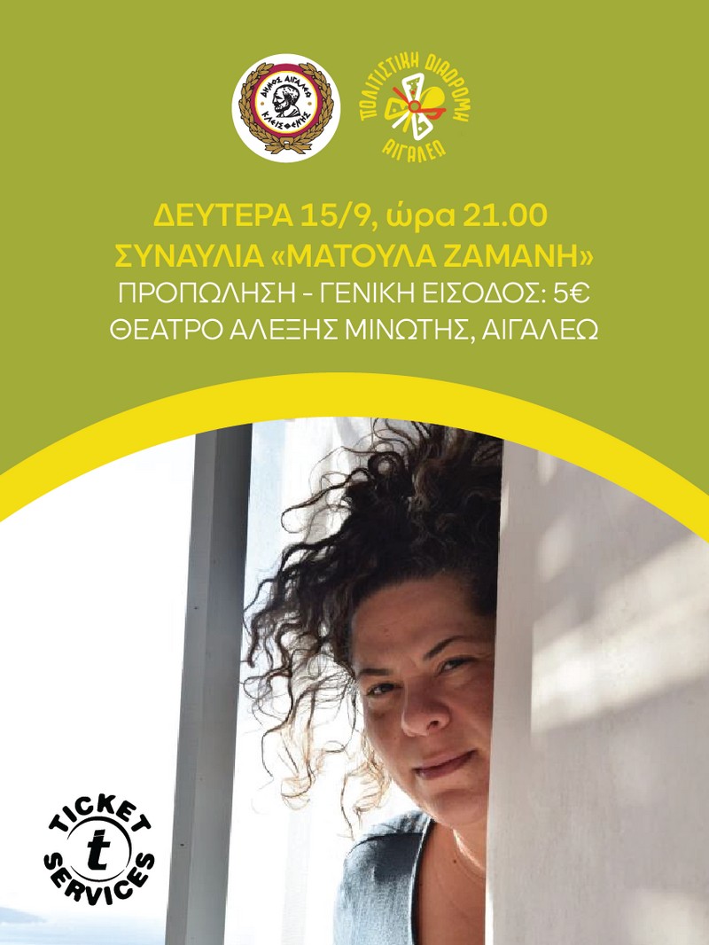 Η «Πολιτιστική Διαδρομή 2025» του Δήμου Αιγάλεω υποδέχεται τη Ματούλα Ζαμάνη, σε μια καλοκαιρινή συναυλία κάτω απ' τον έναστρο ουρανό, τη Δευτέρα 15 Σεπτεμβρίου στις 21:00, στο ανοιχτό θέατρο «Αλέξης Μινωτής».