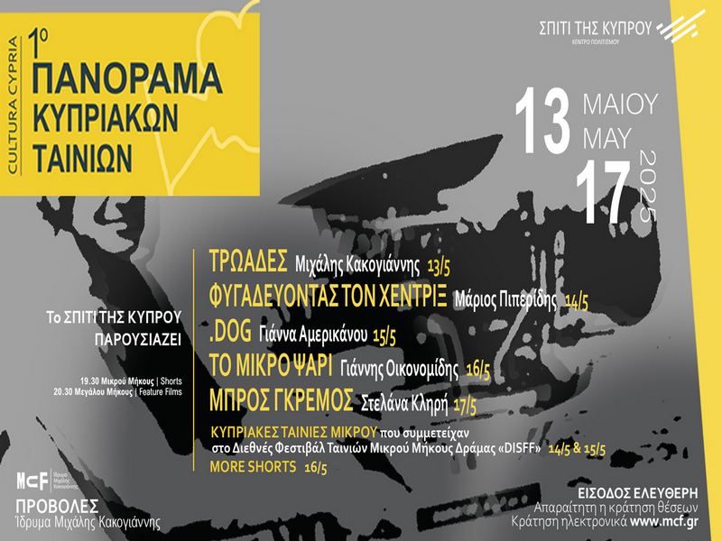 Το Σπίτι της Κύπρου διοργανώνει το 1ο ΠΑΝΟΡΑΜΑ ΚΥΠΡΙΑΚΩΝ ΤΑΙΝΙΩΝ, απότην Τρίτη 13 Μαΐου 2025 έως το Σάββατο 17 Μαΐου 2025, στο Ίδρυμα Μιχάλης Κακογιάννης (Πειραιώς 206, Ταύρος 177 78 | τ. 210 3418550 | Είσοδος ελεύθερη | Απαραίτητη η κράτηση θέσεων | Κράτηση ηλεκτρονικά www.mcf.gr).