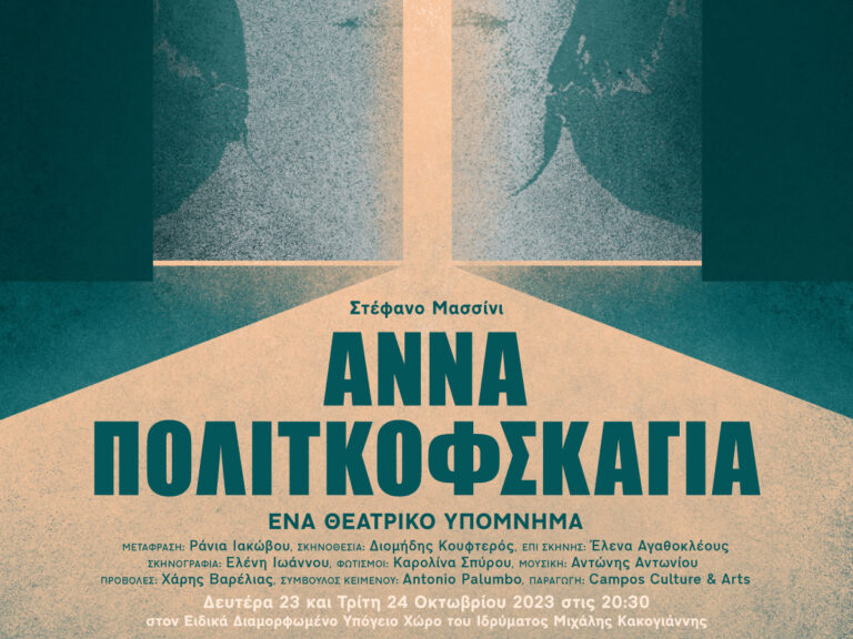 Μετά την επιτυχημένη της παρουσίαση στην Κύπρο, την προηγούμενη θεατρική σεζόν, η παράσταση Άννα Πολιτκόφσκαγια - ένα θεατρικό υπόμνημα της ομάδας Campos Culture and Arts έρχεται και στην Αθήνα, για δύο μόνο παραστάσεις, στις 23 και 24 Οκτωβρίου, στο Ίδρυμα Μιχάλης Κακογιάννης. Πρόκειται για μια παράσταση-ντοκουμέντο, που μιλάει για την πραγματική ιστορία της ατρόμητης Ρωσίδας δημοσιογράφου Άννας Πολιτκόφσκαγια (1958 - 2006), μέσα από μία αγωνιώδη και καταιγιστική ροή εικόνων και ιστορικών γεγονότων. Βασισμένο σε ρεπορτάζ, συνεντεύξεις και συνομιλίες της δημοσιογράφου, το έργο του θεατρικού συγγραφέα Στέφανο Μασσίνι (βραβευμένου με Tony το 2022 για το έργο του Η τριλογία των Λήμαν Μπράδερς), αναπόφευκτα εγείρει παραλληλισμούς με γεγονότα που βιώνουμε σήμερα, όπως την εισβολή στην Ουκρανία και τις παρακολουθήσεις δημοσιογράφων.