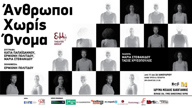 Η θεατρική ομάδα ΈρΜα παρουσιάζει από 11 έως και 26 Ιανουαρίου, κάθε Τρίτη και Τετάρτη, στο Ίδρυμα Μιχάλης Κακογιάννης την παράσταση «Άνθρωποι χωρίς όνομα» η οποία μέσα, από έξι διαφορετικές ιστορίες, επιχειρεί να θίξει το σημαντικό θέμα της έλλειψης ανακουφιστικής φροντίδας, ως παροχή του συστήματος υγείας της χώρας μας.