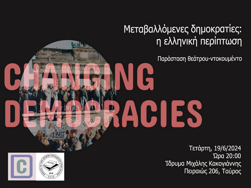 Η παράσταση «Μεταβαλλόμενες Δημοκρατίες: η ελληνική περίπτωση» αποτελεί μέρος του ευρωπαϊκού project «Changing democracies», στο οποίο συμμετέχουν φορείς από 10 ευρωπαϊκές χώρες (Βέλγιο, Ολλανδία, Ισπανία, Πορτογαλία, Κροατία, Ελλάδα, Τσεχία, Ρουμανία, Λιθουανία, Πολωνία).