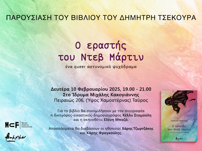 Οι εκδόσεις Βακχικόν σας προσκαλούν στην παρουσίαση του μυθιστορήματος του Δημήτρη Τσεκούρα «Ο εραστής του Ντεβ Μάρτιν» που θα πραγματοποιηθεί στο Ίδρυμα Μιχάλης Κακογιάννης, την Δευτέρα 10 Φεβρουαρίου 2025, 19.00 – 21.00.