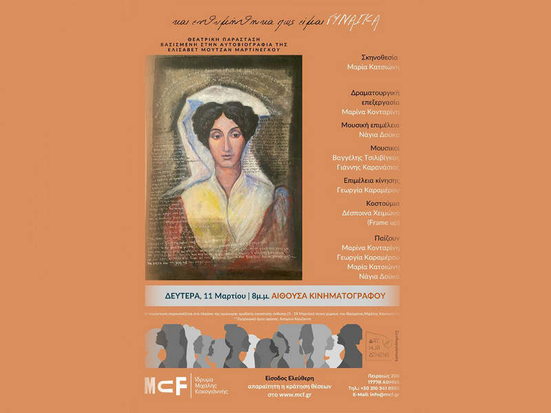 Με αφορμή τα λόγια της Zακυνθινής λόγιας Ελισάβετ Μουτζάν-Μαρτινέγκου (1801-1832), στην αυτοβιογραφία της, μια σημαντική ιστορική μαρτυρία και συγχρόνως το πρώτο αξιόλογο δείγμα γυναικείας γραφής στη νεοελληνική γραμματεία που πρωτοεκδόθηκε το 1881, παρουσιάζεται στο Ίδρυμα Μιχάλης Κακογιάννης, στα πλαίσια της ομαδικής εικαστικής έκθεσης «και ενθυμήθηκα πως είμαι ΓΥΝΑΙΚΑ» η ομώνυμη θεατρική παράσταση σε σκηνοθεσία της Μαρίας Κατσιώνη.