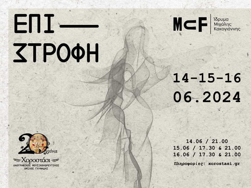 Η παράσταση «Επιστροφή» θα πραγματοποιηθεί στις 14, 15 και 16 Ιουνίου 2024 στο Ίδρυμα Μιχάλης Κακογιάννης, με την κάθε μέρα να περιλαμβάνει διαφορετικό πρόγραμμα, από διαφορετικές περιοχές της Ελλάδας: